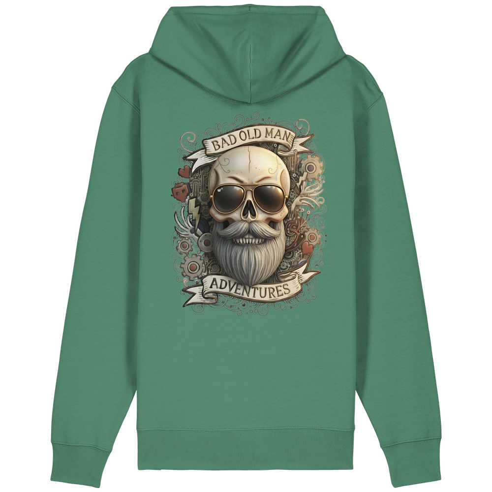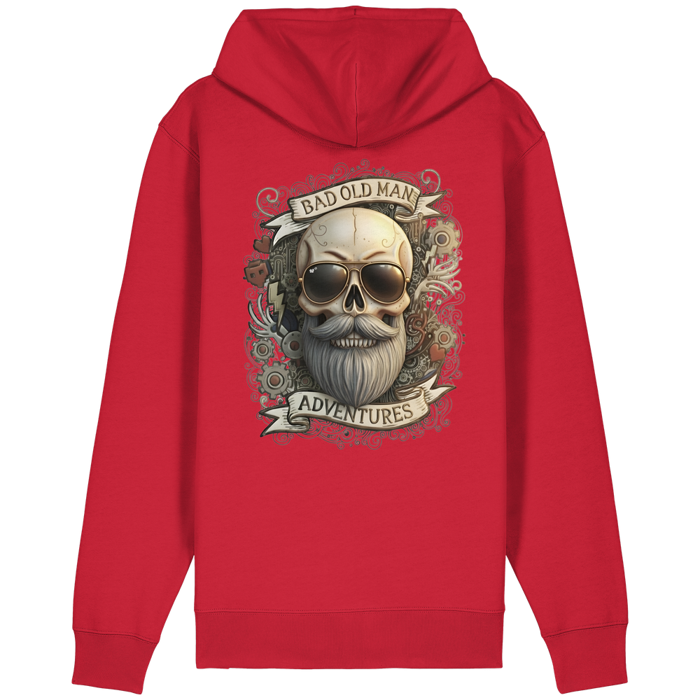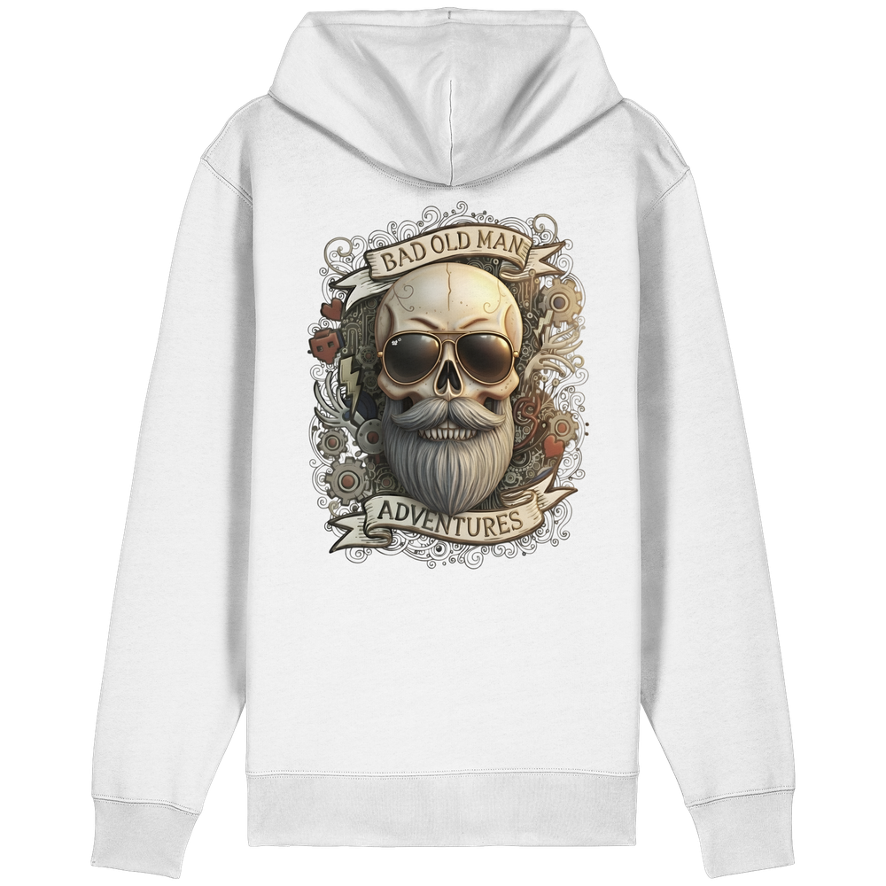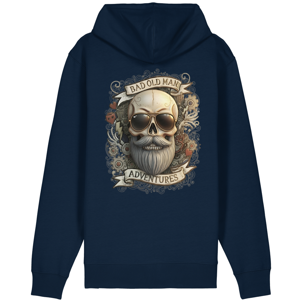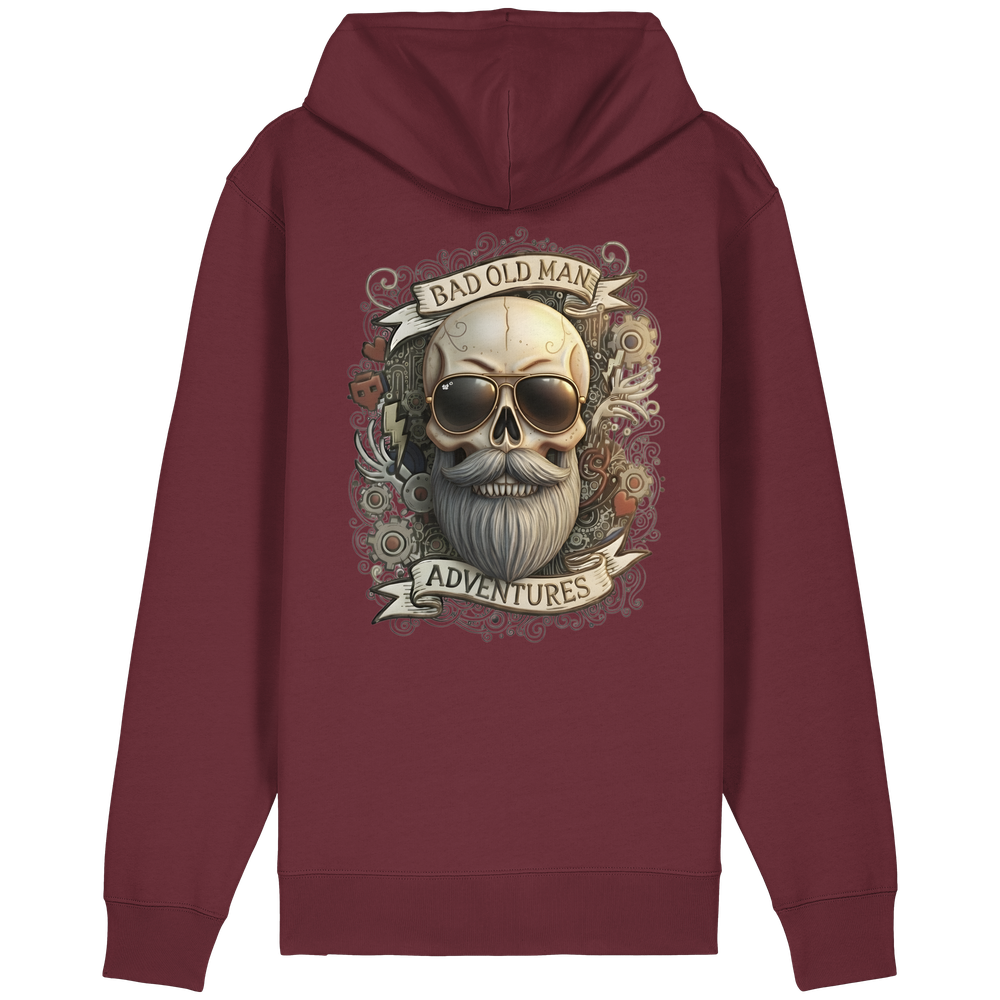Zentrales Motiv: Das offizielle Bad Old Man – Adventures Logo mit dem bärtigen Totenkopf. Ein Symbol für Erfahrung, Charakter und den Mut zum eigenen Weg.